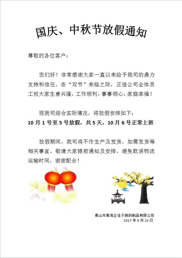 國慶中秋雙節放假通知